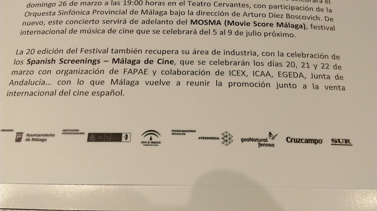 Como en años anteriores, el Festival dedicará un concierto a la música de cine, en este caso a las películas y series españolas o rodadas en España. El concierto se celebrará el domingo 26 de marzo a las 19:00 horas en el Teatro Cervantes, con participación de la Orquesta Sinfónica Provincial de Málaga bajo la dirección de Arturo Díez Boscovich. De nuevo, este concierto servirá de adelanto del MOSMA (Movie Score Málaga), festival internacional de música de cine que se celebrará del 5 al 9 de julio próximo.